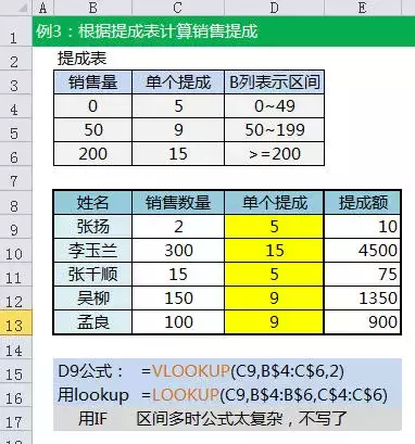公式说明:VLOOKUP和LOOKUP函数都可以按区间取值,一定要注意,销售量列的数字一定要升序排列。