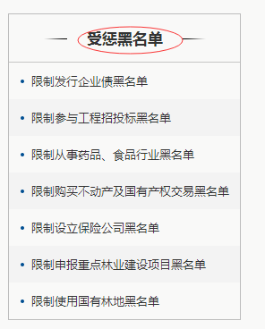 此外,全国信用信息共享平台还设置了“受惩黑名单”,包括:限制参与工程招投标、限制参与基础设施和公共事业特许经营、限制取得政府土地供应、限制购买不动产及国有产权交易、限制发行公司债券、限制股票发行等。