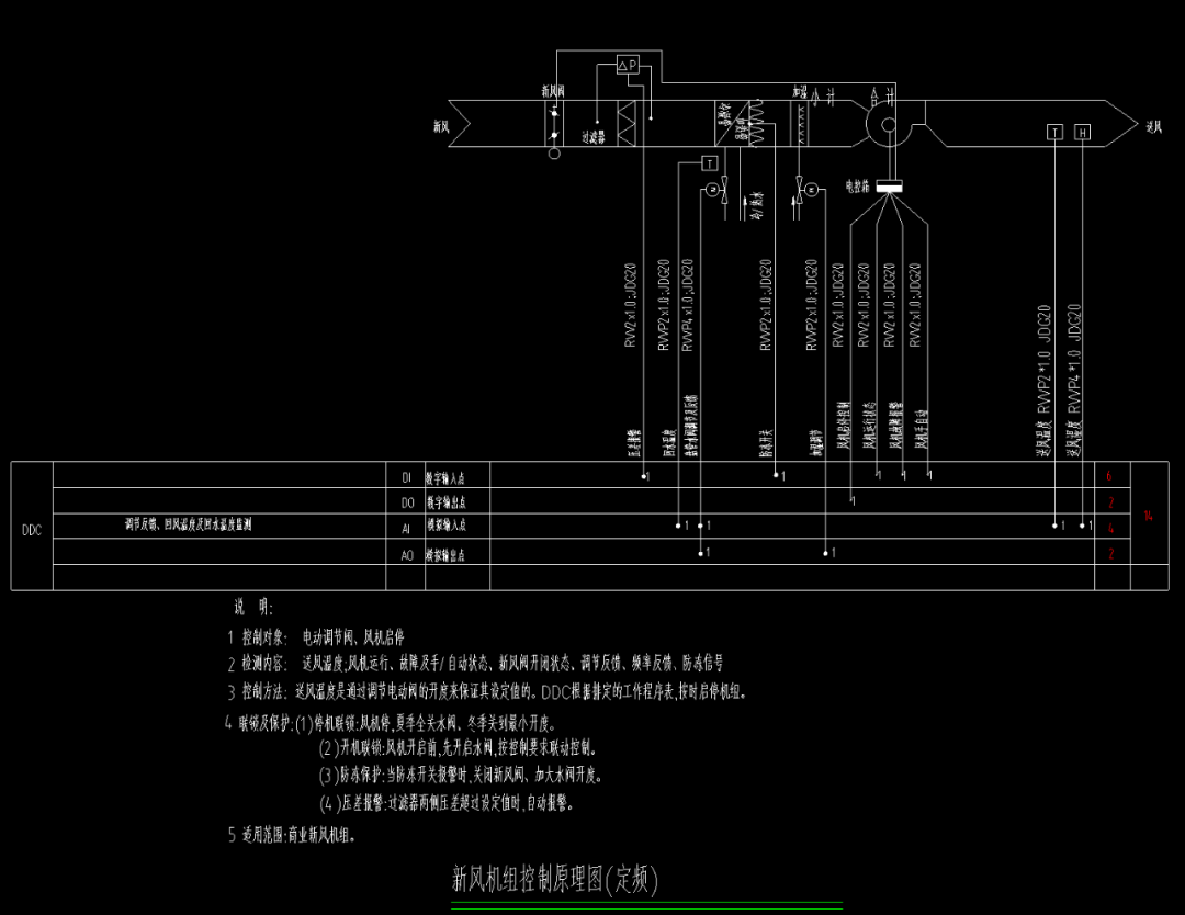 数字控制器(DDC)它具有AI、AO、DI、DO四种输入/输出接口。方便灵活地与现场的传感器、执行调节机构直接相连接,对各种物理量进行测量,以及实现对被控系统的调节与控制。AI-模拟量输入接口,可用作仪表的检测输入,如温度、压力等,一般为0-10V(0-5V)或4-20mA的直流信号。AO-模拟量输出接口,用于操作控制阀、执行器等,如电动阀、三通阀、风门执行器等,不需要外部电源,输出为0-10V的直流信号。DI-数字量输入接口,即触点、液位开关、限位开关的闭合与断开,一般用作检测设备状态、报警接点、脉冲计数等。DO-数字量输出接口,用于控制风机,水泵等运行,亦可作为输出信号与动作增减量型执行机构。