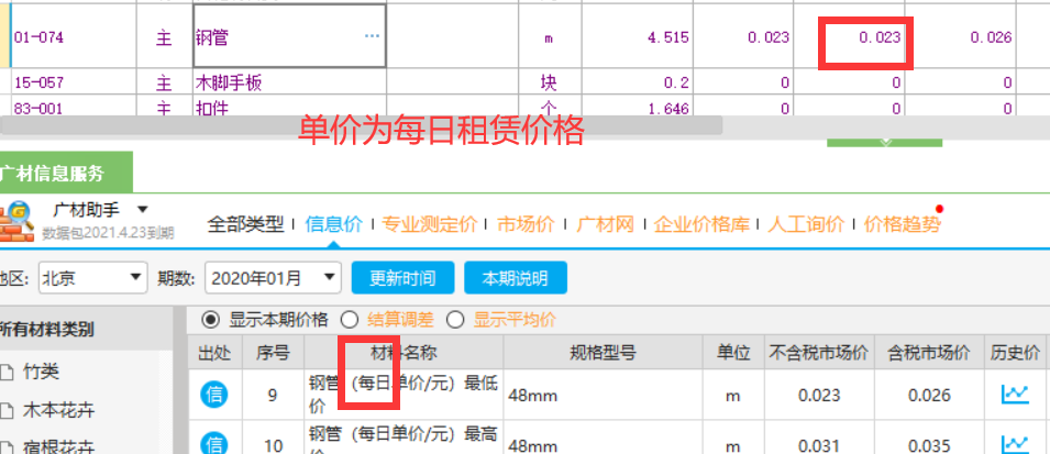 北京地区房修工程清单计价中脚手架材料费,参考信息价调价中信息价中的单价为每日租赁价格,需要根据项目中脚手架的搭设工期,将租赁单价*搭设工期得出材料单价!