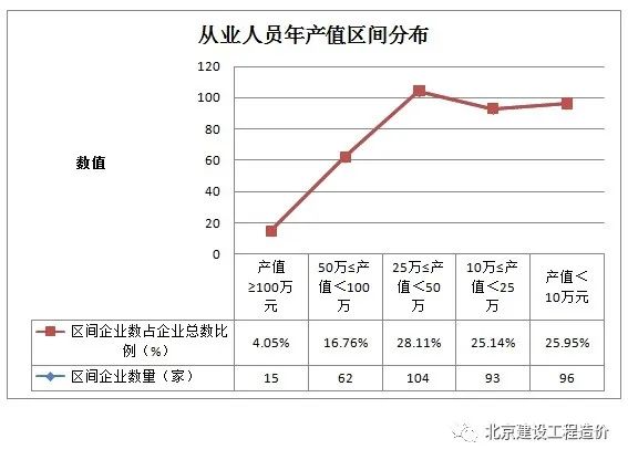 2020年造价咨询统计调查数据显示,以造价工程师人数计算,年产值超过200万元的企业数量最多,约82家,占22%,其次为产值在50万元~100万元的企业,有69家,占19%;以专业技术人员人数计算,年产值在25万元~50万元和50万元~100万元的企业数量最多,分别有69家和68家,各占19%和18%;以从业人员人数计算,年产值在25万元~50万元企业数量最多,有104家,约占28%。高产值企业和低产值企业占比较大,两极分化严重。