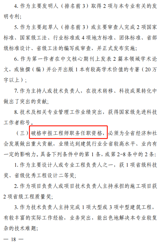 二、破格申报高级工程师和工程师职务任职资格条件,详见下方文件原文(P17-P19)。