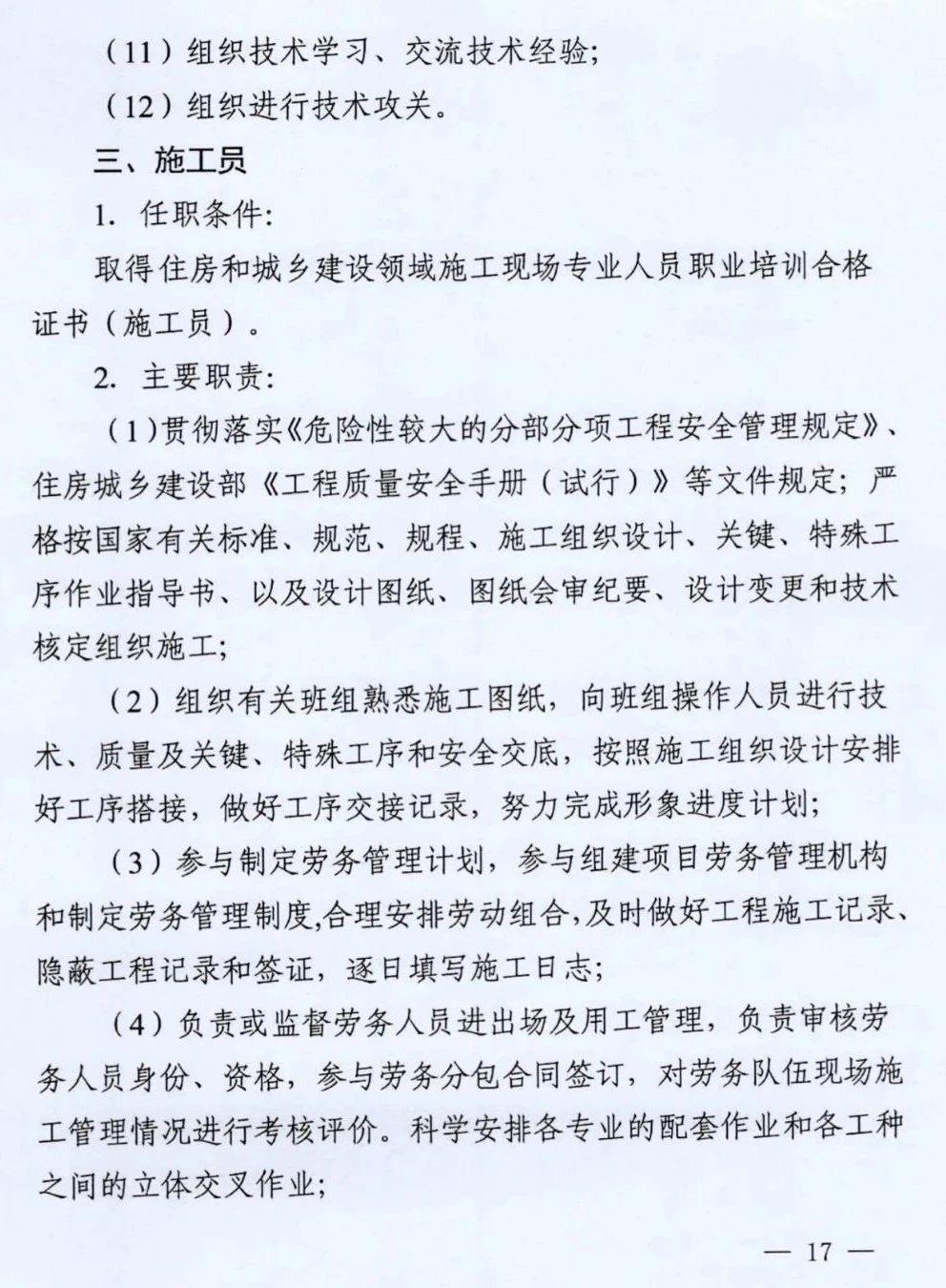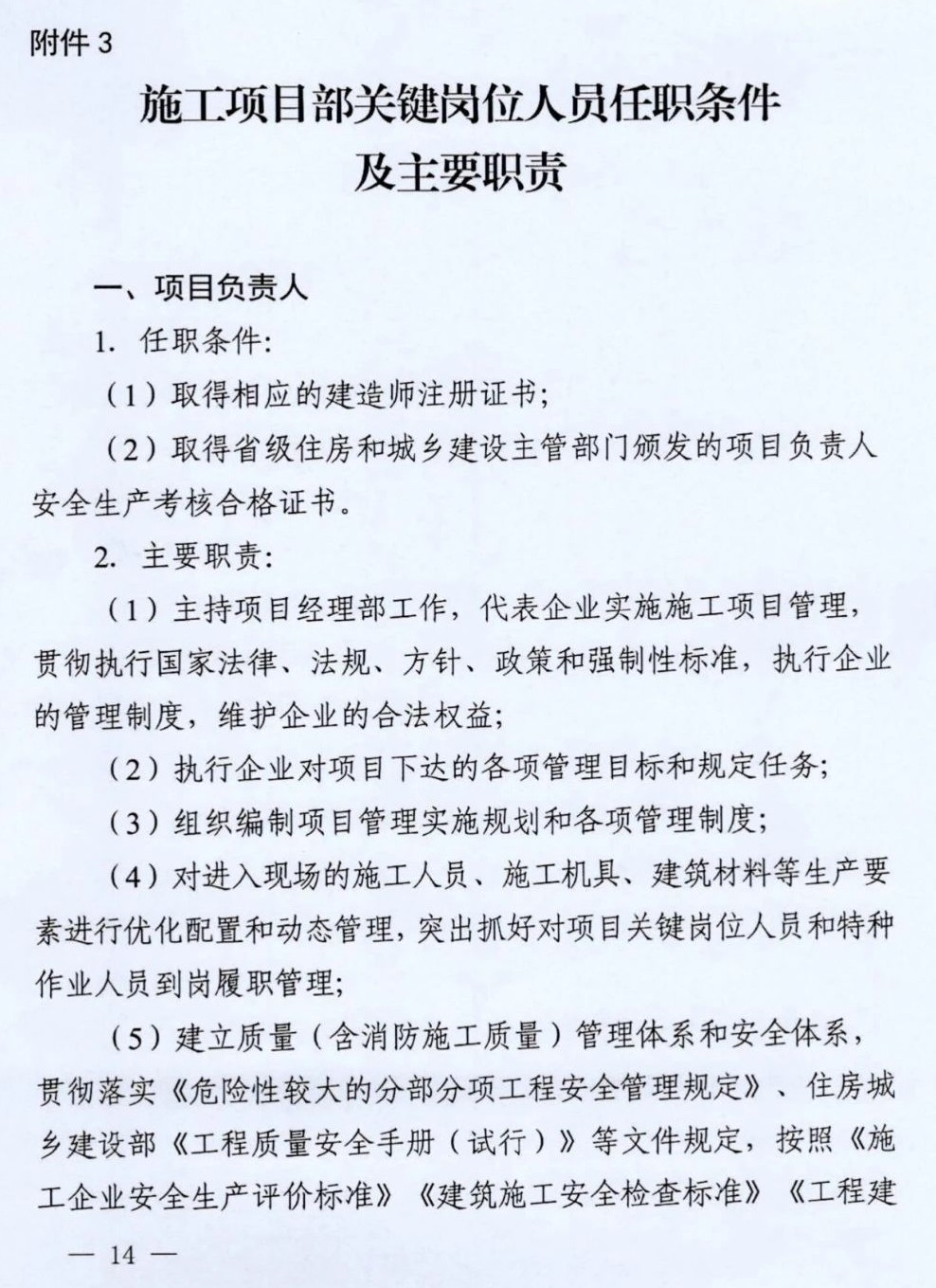 第三条 建筑工程施工项目部、现场监理部关键岗位人员数量不得低于本办法规定(施工项目部关键岗位人员配备标准见附件1、现场监理部关键岗位人员配备标准见附件2),且必须按规定认真履行岗位职责(施工项目部关键岗位人员任职条件和职责详见附件3,现场监理部关键岗位人员任职条件和职责详见附件4)。施工企业应根据工程需要配备其他相应的管理人员。