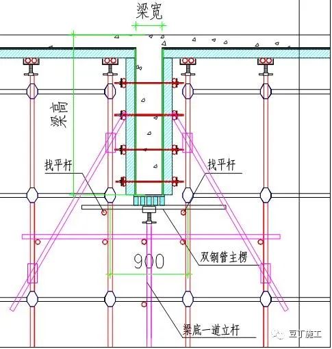梁宽≤500,采用该种模板支设方式(梁两侧立杆间距900mm)