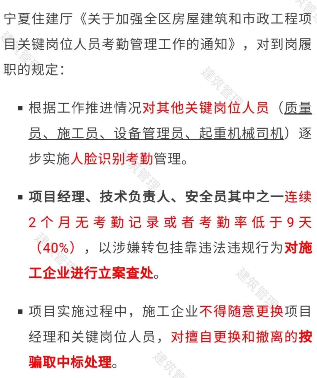 项目经理考勤率低于40%的,对施工企业立案查处!擅自更换人员的,按骗取中标处理!
