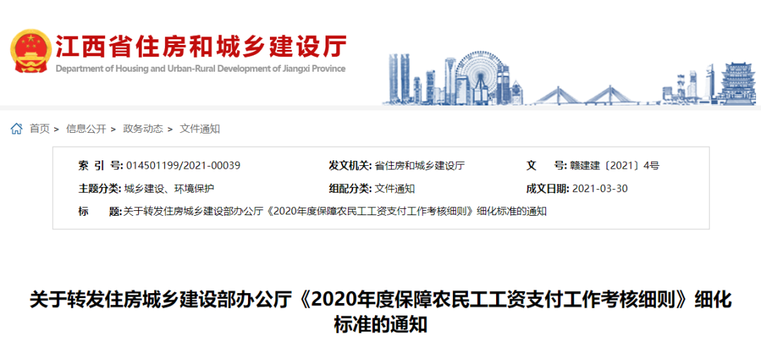 4月15日,江西省住建厅发布《关于转发住房城乡建设部办公厅<2020年度保障农民工工资支付工作考核细则>细化标准的通知》。