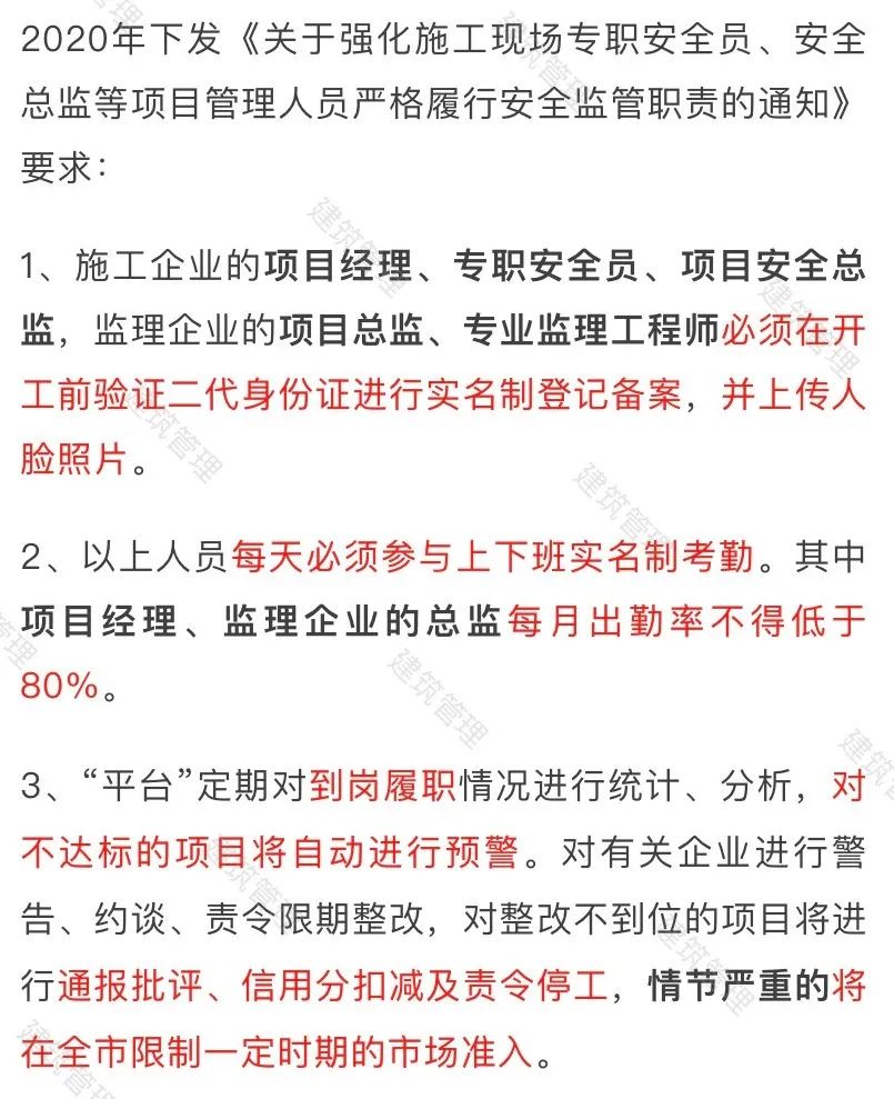 项目经理、总监未到岗,一律停工切断用电!够狠!项目经理、总监需每日两次人脸考勤,4小时以内无效!项目经理等须每天人脸识别考勤!全部实名登记!项目经理到岗率小于60%,按照未到岗月数,延后其招投标系统IC卡解锁时间