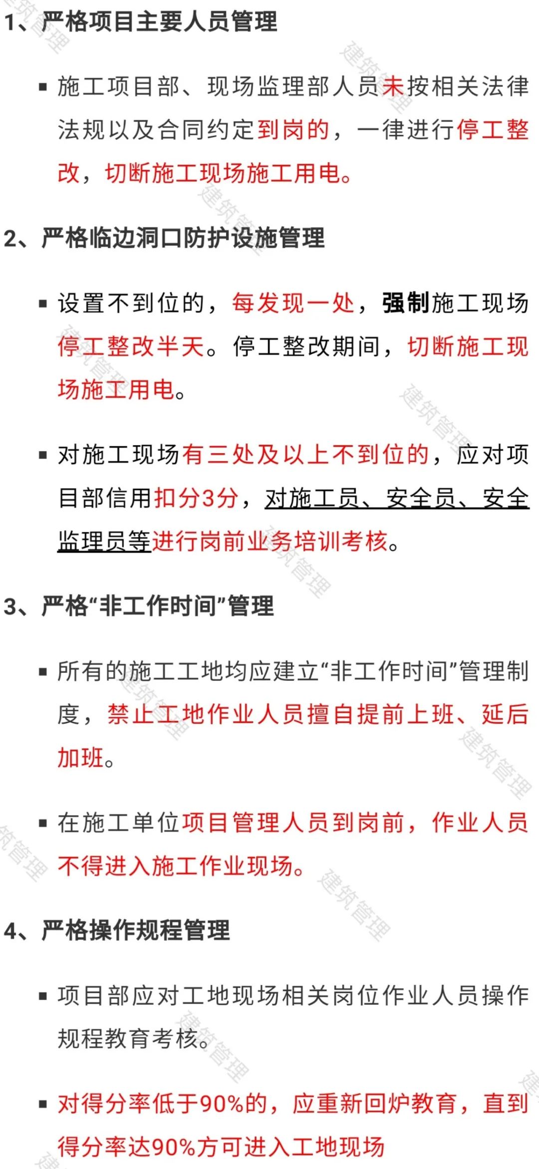 所有的施工工地均应建立“非工作时间”管理制度,禁止工地作业人员擅自提前上班、延后加班。在施工单位项目管理人员到岗前,作业人员不得进入施工作业现场;施工、监理管理人员下班前,应对施工现场进行清场,做好清场记录,关闭施工现场相关施工用电,监理单位应做到同步检查并做好记录。
