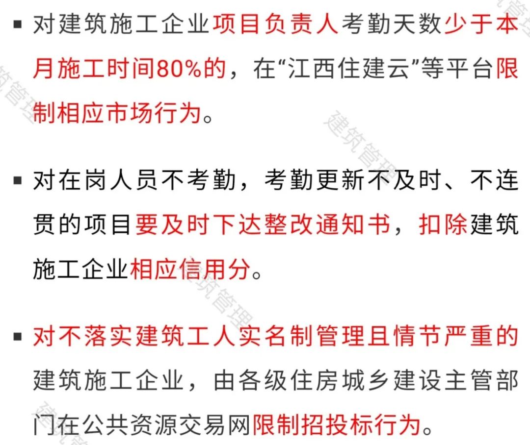 二、落实建筑工人实名制管理。各地要继续加大本地区建筑工人实名制管理工作推进力度,进入施工现场的建设单位、施工单位、监理单位的项目管理人员及建筑工人应全部纳入建筑工人实名制管理范围,强化对日常考勤的监督考核,对在岗人员不考勤,考勤更新不及时、不连贯的项目要及时下达整改通知书,并在信用评价系统中扣除建筑施工企业相应信用分。对不落实建筑工人实名制管理且情节严重的建筑施工企业,由各级住房城乡建设主管部门在公共资源交易网限制招投标行为。对建筑施工企业项目负责人考勤天数少于本月施工时间80%的,在“江西住建云”等平台限制相应市场行为。