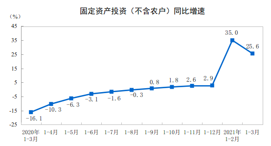 1-3月份,全国固定资产投资(不含农户)95994亿元,同比增长25.6%;比2019年1-3月份增长6.0%,两年平均增长2.9%;经季节调整后与去年10-12月份环比增长2.06%。其中,民间固定资产投资55022亿元,同比增长26.0%。从环比看,3月份固定资产投资(不含农户)增长1.51%。