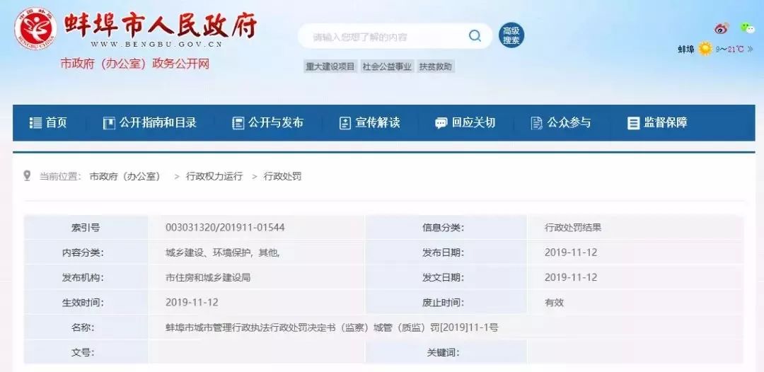 2019年11月,安徽蚌埠淮上区一住宅楼被当地住房和城乡建设局通报。因二层剪力墙混凝土施工未按工程设计图纸施工,经检测未达到设计强度等级,对施工方处以33万余元的罚款。同时对该项目的项目经理处以16588元罚款。