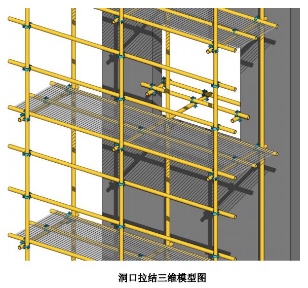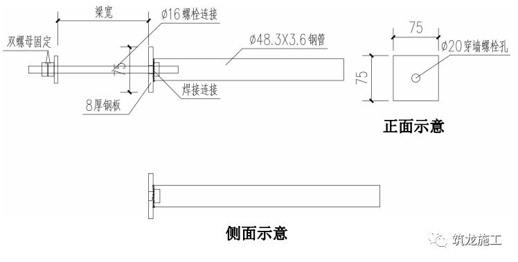 2. 混凝土浇筑前将预埋件埋入剪力墙或梁内(或设置穿墙螺栓孔),刚性连接件焊接螺母的一端套入预埋件(或穿墙螺栓),另一端通过扣件与脚手架立杆固定