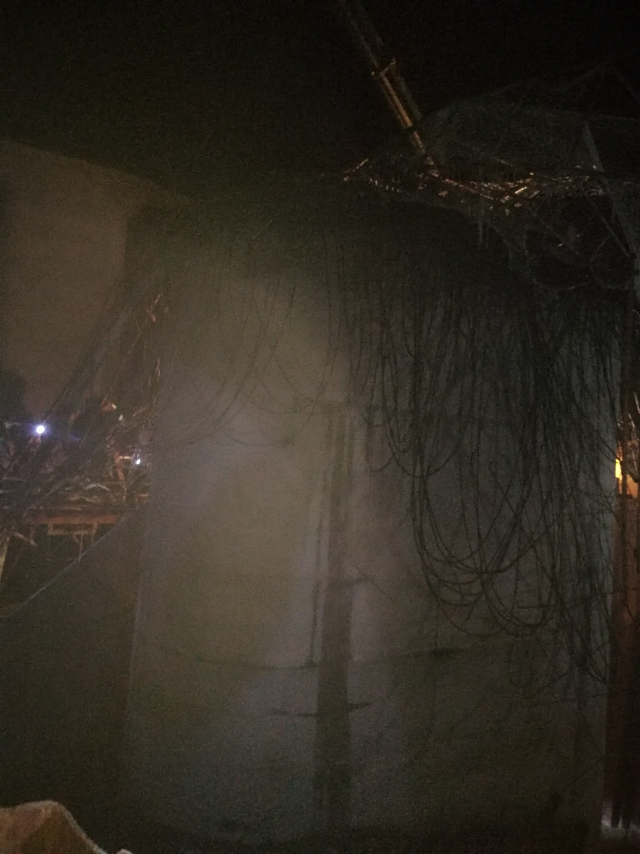 当第16车罐车的混凝土泵送完后,由李某贵和杨某俊两人完成了振捣,此时杨某俊与田某海及王志某一起在模板顶部外侧的作业平台上准备休息一会儿,李某贵因口渴从安全爬梯下去栈桥平台上喝水,当李某贵下至离模板顶部约有3m高(即20.5m墩身高)时(23时51分许),突然“呯”的一声巨响,模板发生爆模引起坍塌(事故现场如图2-1、图2-2、图2-3、图2-4所示),田某海、杨某俊和王志某随坍塌的模板和混凝土一同坠落,李某贵听到响声后,双手紧紧抱住安全爬梯的护栏钢管,致右前额、右手手臂和腰部皮外伤。王志某(泵车操作工)、田某海和杨某俊在坍塌事故中失踪。