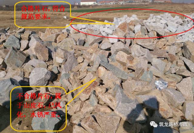 1.2 片石:厚度不小于150mm,不得采用裂纹、风化石、山皮石。片石要有平整面,棱角分明。不得采用无棱角,尺寸超小,薄片状,浑圆状石料。用作镶面的片石,表面要大致平整,边角方正,厚度不小于15cm,达不到要求的要进行加工修饰。