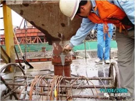在灌注接近结束时,由于导管混凝土柱高度减小,压力降低,而导管管外的泥浆稠度增加,如出现混凝土面上升困难时,可在孔内加水稀释泥浆,并掏出部分沉淀土,使灌注工作顺利进行