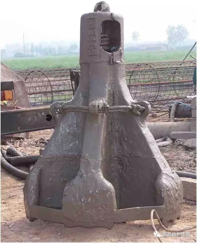 冲抓锥锥头上有一重铁块和活动抓片,通过机架和卷扬机将冲抓锥提升到一定高度,下落时松开卷筒刹车,抓片张开,锥头便自由下落冲入土中,然后开动卷扬机提升锥头,这时抓片闭合抓土。冲抓锥整体提升至地面上卸去土渣,依次循环成孔。
