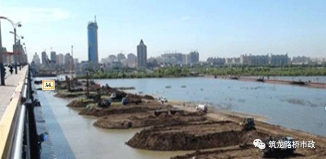 ▲吹沙筑岛完成,钢便桥和吹沙筑岛便道顺利连接