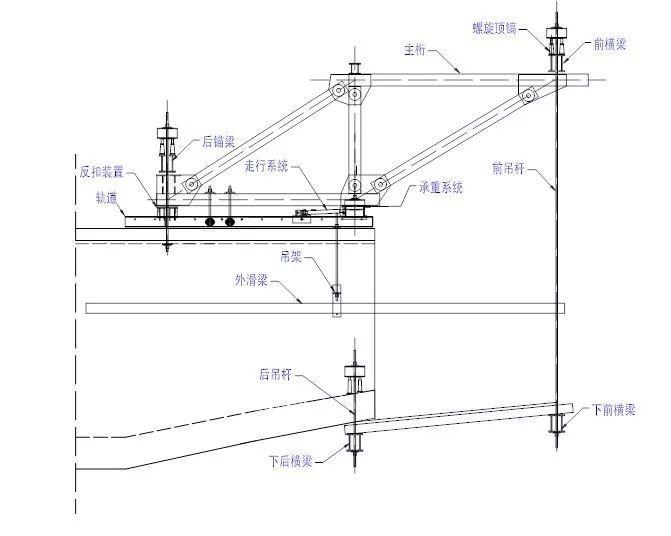 后下锚固:混凝土浇筑时,后下横梁传给已浇梁段底板的承力锚固。
