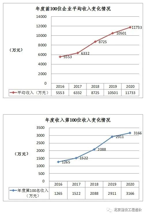 对近五年造价咨询收入占比较高的排名前100位企业的收入情况进行分析,100位企业的平均收入逐年上升,从2016年5553万元到2020年11733万元,增长了111%,年度企业最高收入和第100位企业收入也分别上升了150%和110%。
