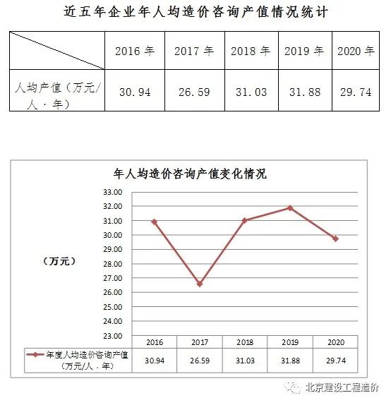 根据统计数据,以从业人员人数计算,近五年企业年度人均造价咨询产值较平稳,围绕30万元/人﹒年上下波动。