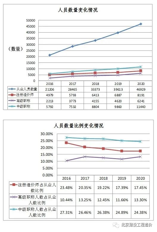统计数据显示,近五年企业从业人员数量呈现逐年递增的趋势,尤其是2020年从业人员数量比2019年增加7316人,注册造价工程师人数逐年增长,而占从业人数比例呈逐年下降趋势,高级职称和中级职称人数同样呈现逐年递增趋势,占从业人数比例在一定范围内趋于平稳。从人员数量来看,造价咨询行业队伍在逐步壮大。