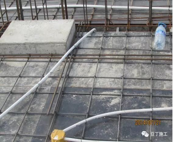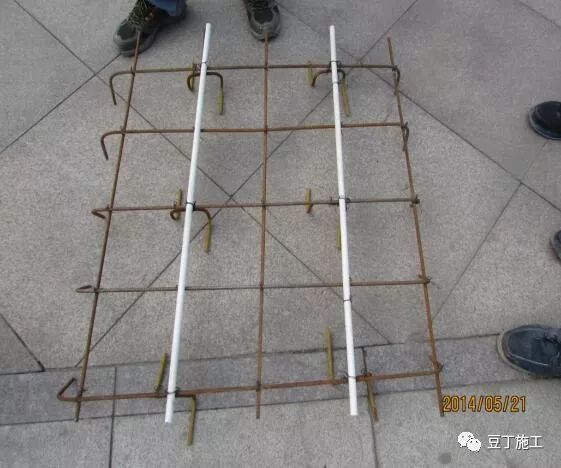 架立筋采用Φ14钢筋穿Φ15PVC管作为辅助架立筋(间距400-600mm),将板的负弯矩钢筋临时悬挂固定于辅助架立筋下,使负弯矩钢筋、辅助架立筋、分布筋和撑脚连成整体(如图),从而构成刚度较大的钢筋网片,能承受一定的冲击力和偶尔的人工踩踏,避免混凝土浇捣过程造成负弯矩筋的严重偏位、下陷和严重变形情况,同时在辅助架力筋两端焊接Φ10钢筋脚,使脚底到架力筋顶面高度为楼板厚度(如开间较大,考虑架立筋起拱)