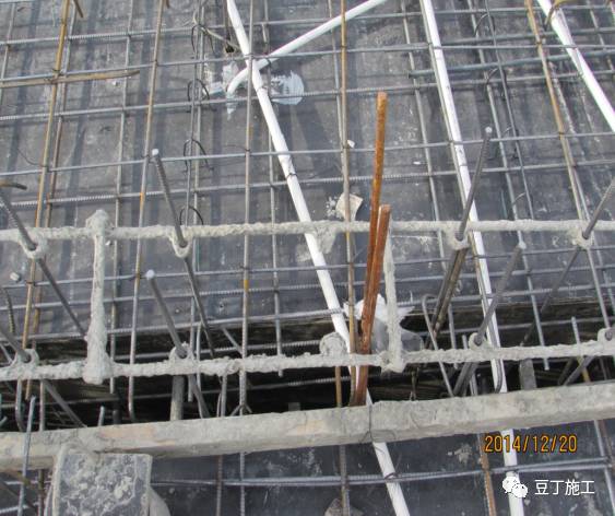 D、钢筋定位:墙体竖向梯子筋:间距1.2m布置,可代替墙体竖向钢筋,但要比设计直径大一规格;水平梯子筋:控制立筋间距及位置,设置一道水平梯子筋,距板高度不大于300mm, 作为上层定位筋周转使用 ;双F卡、塑料垫块:控制墙体钢筋截面及钢筋保护层厚度,双F卡间距800mm梅花形布置且必须与钢筋绑扎牢固,塑料垫块间距400mm梅花形布置,墙钢筋间距不得大于10mm,保护层厚度偏差不得超过±5mm。