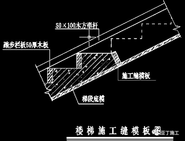 楼梯上的施工缝应留在踏步板的1/3 处(或至少三个踏步),但要注意接缝面应斜向垂直于楼梯轴线方向。如下图所示:
