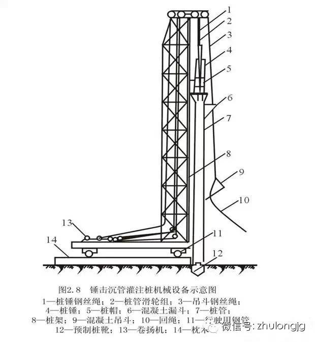 利用锤击沉桩设备沉管、拔管成桩,称为锤击沉管灌注桩;利用振动器振动沉管、拔管成桩,称为振动沉管灌注桩。