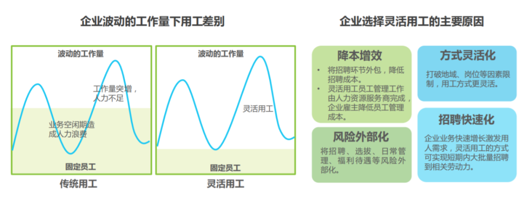 核心解决人力资源合理配置的问题,降本增效是最主要原因,通常制造企业或服务企业,会遇到订单的“贸易波动、季节性波动、时间性波动”等变动情况,而采用灵活用工的方式,则有效解决在波动的业务量下人力资源浪费或人手不够的问题。