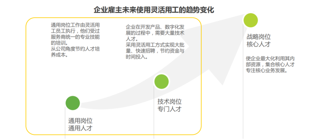 企业雇主 “人才为企业所有”的理念正在转变为“人才为企业所用” ,企业岗人匹配主要以通用岗位通用人才、技术岗位专门人才和战略岗位核心人才划分。未来,企业会逐步扩大对灵活用工业务的配置,主要体现在,增加通用岗位与技术岗位灵活用工员工的数量。把非核心业务包出去,专做核心业务,采用灵活用工方式可以使企业集中核心人力资源专注核心业务发展,提升业务运营效率,保障效益最大化。