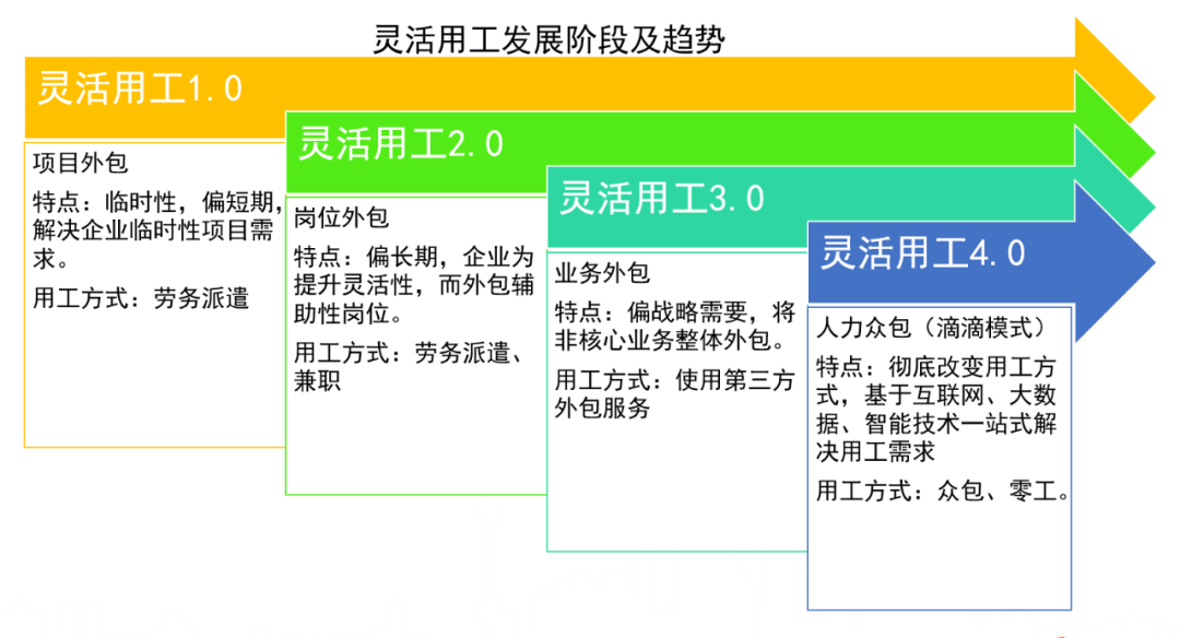 生产力的变革会带来生产关系的变革,灵活用工随着技术和社会环境变革,也在发生快速的演进和迭代,从项目外包、岗位外包、业务外包,到人力众包方向发展。