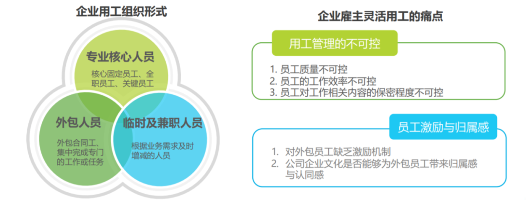 企业在使用灵活用工过程中,也会面临以下问题:1)用工管理不可控。相比传统用工,企业降低了用工成本,轻过程管控,但在劳动力质量、工作积极性、工作保密度等方面存在不可控因素。2)员工缺乏归属感。面对外包员工及兼职员工,企业是否有相应的激励机制。