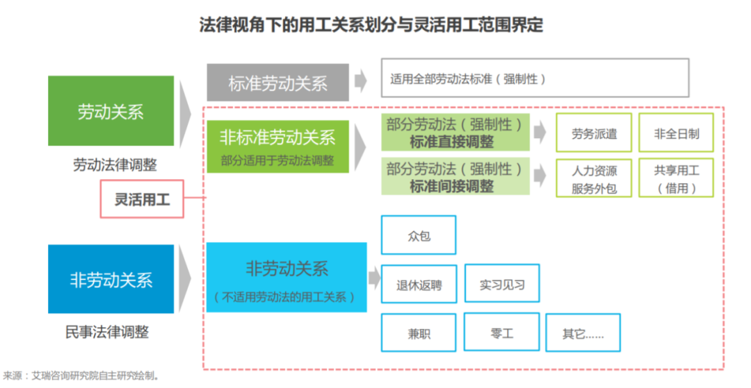灵活用工概念界定,相对标准劳动(雇佣)关系更加灵活的用工方式 ,相对于劳动法完全适用的标准劳动关系,广义的灵活用工涵盖非标准劳动关系和非劳动关系两种,其中非标准劳动关系部 分适用于劳动法调整,非劳动关系是劳动法标准之外的用工关系,属于民事法律调整。灵活用工形式有较为明显的灵活性, 可有效帮助企业进行用工成本控制和提升用工效益。