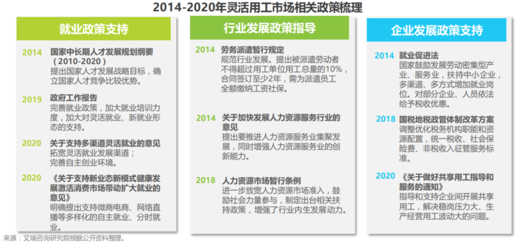 近年来,国家多部门发布了关于就业支持、人力资源行业发展等相关政策,具体包括:支持劳动者选择新业态、多样化的就业方式;规范人力资源行业健康有序发展;扶持企业发展,多方式增加就业岗位促进就业,税改政策规范企业对劳动者的权益保障等。