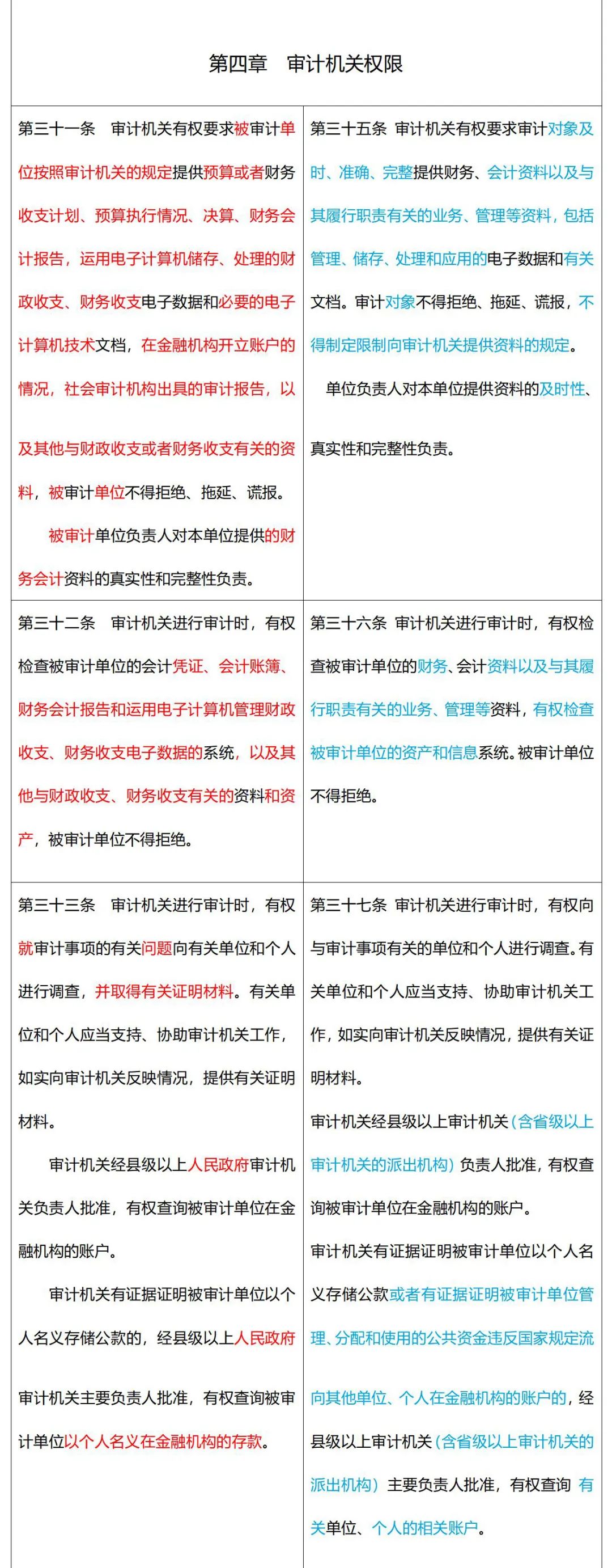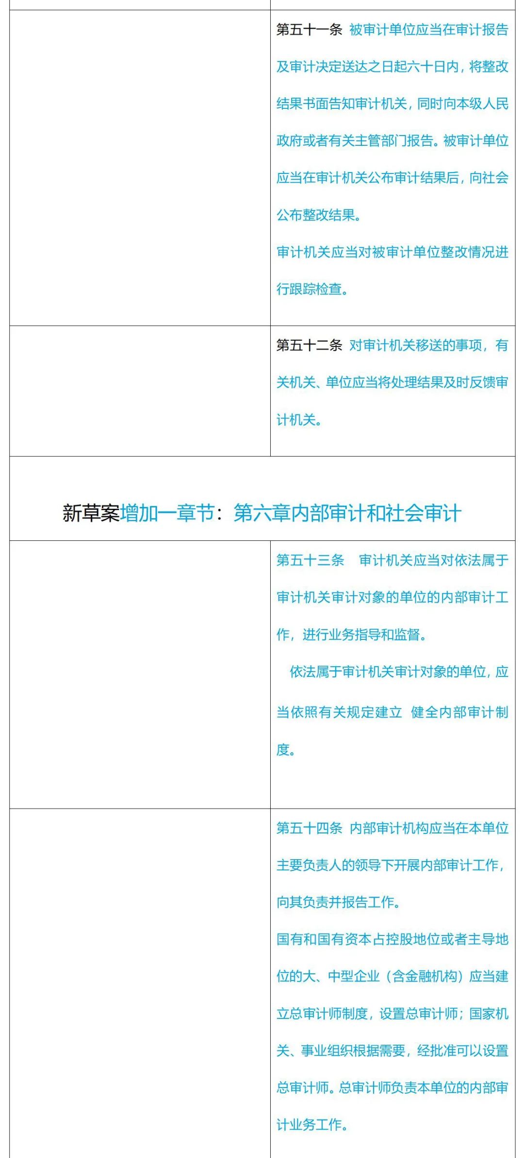 现行审计法共54条,此次修改了49条(修改后减少1条),新增14条,修订后共67条。并于2019年3月15日至4月15日向社会公布征求意见。