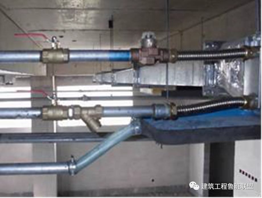 1、风机盘管安装后未合理配管,造成用软接强扭来连接设备;1、风机盘管进出水管处采用柔性连接方式,即在进出水口处安装金属波纹管,降低风机盘管在运转时的振动,也可缓冲因其振动使管道接头处或管道受力;2、冷凝水管与风机盘管连接时,宜设置透明胶管,长度不宜大于150mm,接口应连接牢固、严密,坡向正确,无扭曲;