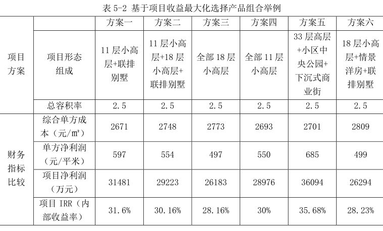 对房地产开发项目而言,本阶段产生的无效成本多为隐性无效成本。在本阶段,工作重点是项目收益最大化,应做好项目级成本策划和产品级成本策划。项目级的成本策划,应基于不同的产品组合,根据市场行情对销售价格进行研判,对项目的整体方案进行不同业态组合背景下的收益对比,最终得出并锁定其货值最大化的方案。具体如表5-2所示例。