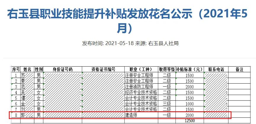 山西省朔州市右玉县技能提升补贴名单公示,5月份共计补贴人数有8人,其中建造师1人,对应等级为1级,申领补贴2000元。