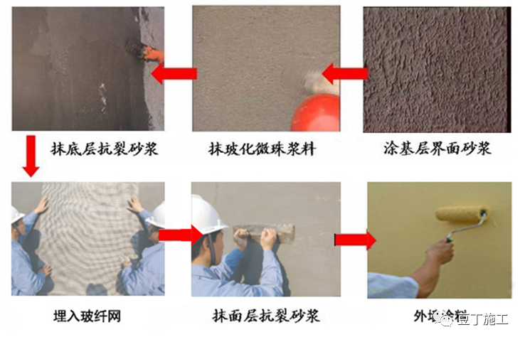 (1)彻底清除基层墙体表面浮灰、油污、脱膜剂、空鼓及风化物等影响墙面施工的物质,墙体表面突出物大于或等于10mm时应剔除,剔除凹凸出墙面部分后,应用保温砂浆或水泥砂浆找平。(2)吊垂线、套方、弹保温层厚度控制线:根据保温层厚度要求挂垂直基准线,并在墙面弹出外门窗水平线、垂直控制线、分隔缝线等。(3)按设计要求的保温层厚度,用中空玻化微珠无机保温砂浆打点做标准厚度灰饼,冲筋,以控制保温层的厚度。灰饼、冲筋做法:按设计的保温层厚度用中空玻化微珠无机保温砂浆做灰饼、冲筋,灰饼、冲筋之间的距离不超过1.5m。(4)涂刷界面剂:首先将界面剂粉料与水以4∶1左右的比例机械搅拌成粘稠的浆料,使其达到均匀无结块;使用抹子等工具将浆料一次批涂在混凝土等基层的表面,批嵌厚度宜控制在2-4mm之间;界面剂批涂后5-10分钟内进行保温砂浆层的粉刷;已拌好的界面剂浆料宜控制在3小时内用完。(1)玻化微珠无机保温砂浆配制:玻化微珠无机保温砂浆应按照设计或产品使用说明书配制,采用机械搅拌,按照包装袋上加水比例说明,先在砂浆搅拌机中加水,然后加入保温浆料干混料,至搅拌均匀且出现粘性时止,搅拌时间约3min-5min,静置3min-5min后才能使用,并应在2h内用完。(2)玻化微珠无机保温砂浆施工:保温砂浆层与基层之间及各层之间粘结必须牢固,不应脱层、空鼓和开裂。保温砂浆层应分层施工,每层保温砂浆厚度不宜大于20mm,待厚度达到冲筋厚度时,先用大杠搓平,再用木抹抹平压实。门窗、洞口垂直度、平整度应达到验收标准要求。(3)玻化微珠保温砂浆施工应自上而下,施工温度不低于5℃。(4)玻化微珠保温砂浆养护及验收:施工后24h内应做好保温层的防护,严禁水冲、撞击和振动。保温砂浆终凝后应及时进行洒水养护。保温层应垂直、平整、阴阳角方正、顺直,否则应进行修补。(1)抗裂砂浆施工:应在保温砂浆干燥固化后进行下道工序,抗裂砂浆应满足设计要求厚度并应分遍施工,搅拌好的抗裂砂浆应在1.5h内用完,具体做法:先抹第一道抗裂砂浆,在砂浆初凝前铺贴耐碱玻纤网格布,然后再抹第二道抗裂砂浆,不得有干贴现象,粘贴饱满度应达到100%。1)耐碱玻纤网格布拼接应采用搭接法,搭接长度不得小于100mm。2)墙体阴、阳角部位以及门窗洞口等有附加耐碱玻纤网格布的部位,应在抗裂砂浆大面积施工前先用抗裂砂浆局部铺贴。3)施工时耐碱玻纤网格布应顺势找直、抹平,并保持阴阳角的方正和垂直度。两层耐碱玻纤网格布之间应有抗裂砂浆层,不得干叠、皱折。铺贴时不得用力拉扯耐碱玻纤网格布。(3)验收清理,进入下一道工序施工(可参考恒大地产集团工程施工工艺指引(第三批)中外墙涂料、真石漆施工工艺)。