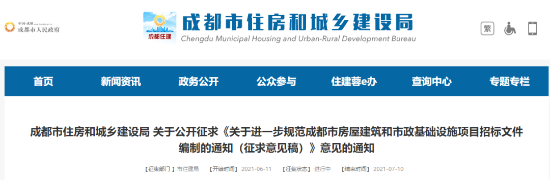 近日,成都市住建局公开征求《关于进一步规范成都市房屋建筑和市政基础设施项目招标文件编制的通知(征求意见稿)》意见。