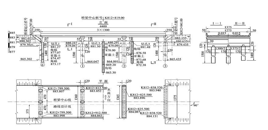 桥梁总体布置图是指导桥梁施工的主要图样,它主要表明桥梁的型式、跨径、孔数、总体尺寸、桥面宽度、桥梁各部分的标高、各主要构件的相互位置关系及总的技术说明等,作为施工时确定墩台位置、安装构件和控制标高的依据。它一般由立面图(或纵断面图)、平面图和剖面图组成。
