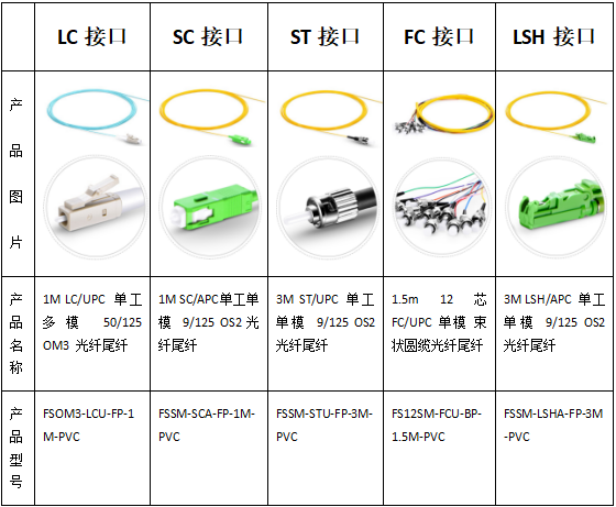 7. 光纤接头  一种双向光纤连接器。传输系统常用的尾纤有LC\SC\ST\FC\LSH五种接口的,连接头形状和颜色和对应类型跳线的连接头相同。