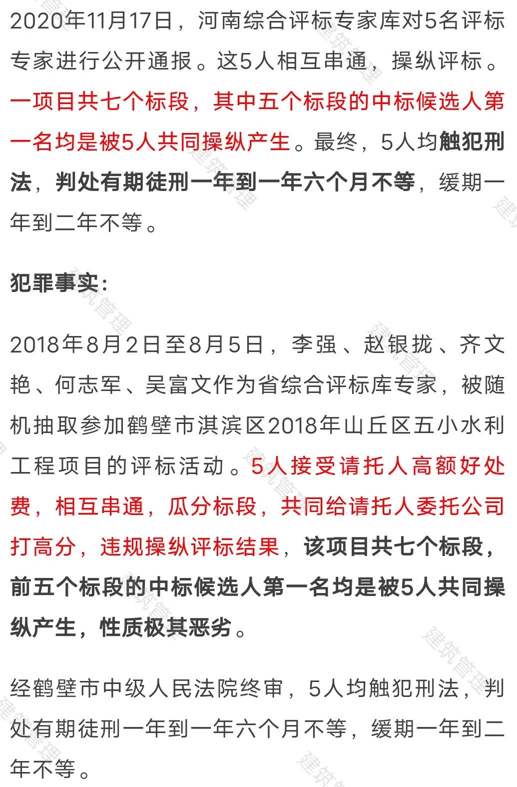 此前,河南省发布通知,接到举报发现两起河南省综合评标专家库评标专家通过微信群探听、泄露评标信息的行为。经调查,对这两名专家予以暂停六个月和十二个月抽取资格。