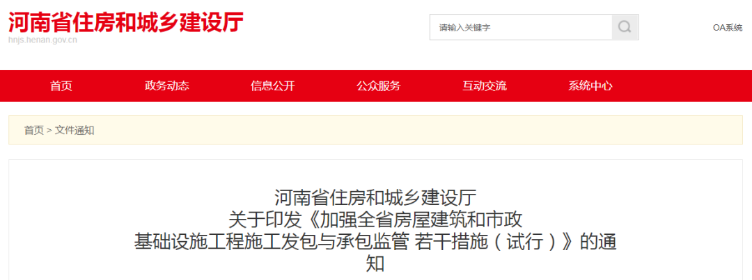 近日,河南省住建厅印发《加强全省房屋建筑和市政基础设施工程施工发包与承包监管若干措施(试行)》的通知,明确要求: