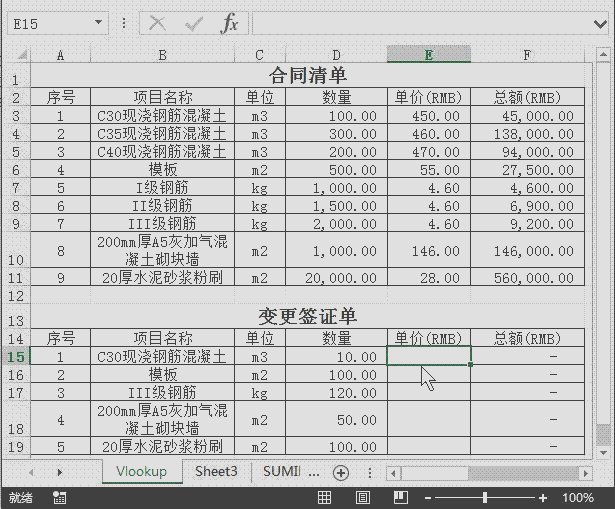 请注意,需要将各项工程量进行分类(如11、12……)。笔者再解释下单元格D14的公式“=SUMIF($C$2:$C$12,C14,$D$2:$D$12)”:第一个参数“$C$2:$C$12”和第三个参数”$D$2:$D$12“必须保持单元格行数对应。比如本案例中"分类"列的起始行数为2,"工程量"列的起始行数也必须为2。同样,"分类"列的结束行数为12,"工程量"列的结束行数也必须为12。另外,这两个参数必须用”$”锁定单元格,这么做是为了方便后期批量复制单元格的时候分类汇总数据不会随粘贴单元格位置的不同而变化。