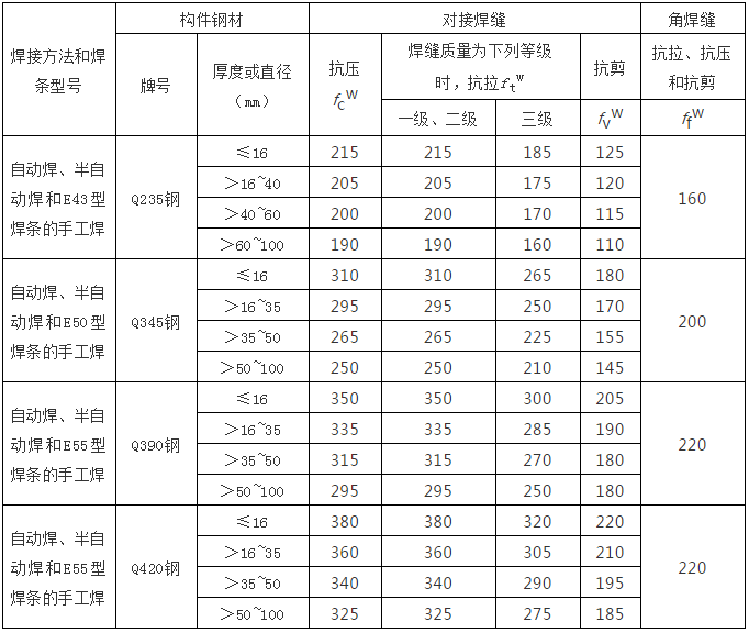 焊缝的强度设计值(N/mm2) 表3