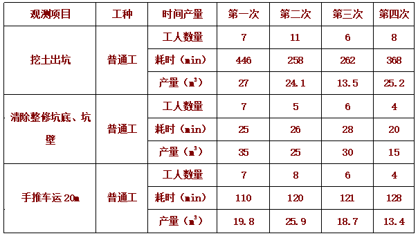 4、章(节)说明:概算上册:路基工程、路面工程、隧道工程和涵洞工程。下册:桥梁工程、交通工程及沿线设施、临时工程。预算上册:路基工程、路面工程、隧道工程和桥涵工程的第一节至第六节。下册:桥涵工程第七节至第十一节、防护工程、交通工程及沿线设施、临时工程、材料采集及加工、材料运输;路面材料计算基础数据,基本定额,材料周转及摊销,定额基价、人工、材料单位质量、单价表。(2)确定定额编号:【页-表-栏】【23-1-1-14-1】、【表-栏】【1-1-14-1】、数码式10114001(3)阅读说明:1、确定定额表号是否有误。例如:浆砌块石护拱、浆砌块石护坡两者预算表号分别为【442-4-5-3-2】和【741-5-1-10-3】。2、确定定额值。(4)定额抽换:当设计内容或实际工作内容与定额表中规定的内容不完全相符时,应根据“说明”及“注”的规定调整定额值,即定额抽换。定义:在正常的生产技术和生产组织条件下,为生产或完成一定量合格的产品或工作所规定的劳动量消耗标准。在技术条件正常、生产工具使用合理和劳动组织正确的条件下,工人为生产合格产品消耗的劳动时间。包括准备时间、结束时间、基本生产时间、辅助时间,不可避免的中断时间以及工人必须休息的时间。时间定额以工日为单位,1工日相当于1个工人工作8h的劳动量。用测时法进行人工挖基坑土方定额的测定,现场测定情况如下表1。假定基坑体积为75m3,清理整修坑底、坑壁体积为36m3,运土体积为回填后多余的土体,体积为32m3,不考虑运土便道。据经验,估计非工作耗时(指准备工作时间、合理中断时间和休息及结束整理时间)占定额时间的15%。问:请用上述资料计算人工挖基坑土方的劳动定额,定额单位取10m3。工作内容为:人工挖、装基坑土方并运出坑外:20m内弃土,清理基底、坑壁。挖土出坑基本时间消耗=(7*446+11*285+6*262+8*368)/(27+24.1+13.5+25.2)=119.967(min/m3)挖土出坑定额时间消耗:119.967/0.85=141.138(min/ m3)计算清理整修坑底、坑壁基本时间消耗=(7*25+5*26+6*28+4*20)/(35+25+30+15)=5.267(min/ m3)计算清理整修坑底、坑壁定额时间消耗=5.267/0.85=6.196(min/ m3)计算手运土基本时间消耗=(7*110+8*120+6*121+4*128)/(19.8+25.9+18.7+13.4)=38.149(min/ m3)手推车运土定额时间消耗=38.149/0.85=44.881(min/ m3)挖基坑定额时间=141.138*75+6.196*36+44.881*32=12244.598(min/ m3)挖基坑的劳动定额=12244.598/60/8/75*10=3.401(工日/10m3)用工作量写实法,确定自卸汽车运输路基土方(装载机装车)的机械定额。已知各项基础参数如下表所示:问:1、假定时间利用系数为0.9,请问其循环工作时间和台班循环数是多少?2、假定自卸汽车的车箱容积为8m3,每天施工12h,每天准备机具和保养等消耗的时间为10min,试计算每1000m3时间定额。答:1、循环工作时间=装车+卸车+调位+等待+运行所消耗的时间之和,即为:3.305+1.325+1.250+1.000+11.952+10.676=29.508(min)台班循环次数=台班工作时间*时间利用系数/循环工作时间,即:每天施工12h,自卸汽车循环次数=(12*60-10)*0.9/29.508=21.655(次)每天施工完成土方数量=21.655*8=173.241(m3)时间定额=12/8/173.241*1000=8.658(台班/1000m3)工作日写实法测算某项工作的测时数据表