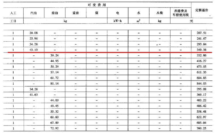 1、时间定额:1台班相当于1台机械工作8h的劳动量。其中潜水设备每台班按6h计算,变压器和配电设备每台班按24h计算。公路工程机械台班费用定额:2008年1月1日交通部颁布执行。1、定义:以一个台班为单位,规定其所消耗的工时、燃料、费用等数量标准。2、分类(共11大类,746个子目):土石方工程机械、路面工程机械、混凝土及灰浆机械、水平运输机械、起重及垂直运输机械、打桩、钻孔机械、泵类机械、金属、木、石料加工机械、动力机械、工程机械、其他机械等。1、折旧费:机械设备在规定使用期限内陆续收回其原值的费用。2、大修理费:机械设备按规定的大维修间隔台班必须进行大维修,以恢复正常功能所需费用。3、经常维修费:机械设备除大维修以外的各级保养及为排除临时故障所需费用;为保障机械正常运转所需替换设备、随机使用工具、附具摊销和维护的费用;机械运转与日常保养所需的润滑油脂、擦拭材料(布及棉纱等)费用和机械在规定年工作台班以外的维护、保养费用等。4、安装拆卸及辅助设施费包括安置机械的基础、底座及固定锚桩等费用。打桩、钻孔机械在施工过程中的过墩、移位等所发生的安装及拆卸费包括在工程项目费用之内;稳定土厂拌和设备、沥青乳化设备、黑色粒料拌和设备、沥青混合料拌和设备、混凝土搅拌站、塔式起重机、施工电梯的安装、拆卸以及拌和设备、大型发电机的混凝土基础、沉淀池、散热池等辅助设施和机械所需的轨道、工作台的设置费用不在此项费用内,在工程项目中另行计算。(2)可变费用:其费用随当地物价水平而变化的费用。构成可变费用的资源主要有人工、燃料、水、电、养路费及车船使用税等。在计算台班单价时,随机操作人员数量及动力、物资消耗量应以定额中的数值为准,工资标准按《编制办法》的规定执行,工程船舶和潜水设备的工日单价按当地有关部门规定计算。动力燃料按当地动力物资的工地预算价格计算;养路费及车船使用税,如需缴纳时,就按各省、自治区、直辖市及国务院有关部门规定的标准,按机械的年工作台班计入台班费中。基价是不变费用和可变费用的合计数。其中不变费用是按定额规定编制的,可变费用中的人工费、动力燃料费按下表预算价格计算。