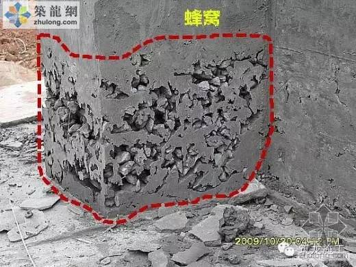 蜂窝有表面的、深井的和贯通的三种,也常遇到水平的、倾斜的、斜交的单独蜂窝和相连的蜂窝群,其表现为局部表面酥松,无水泥浆,粗骨料外露深度大于5mm(小于混凝土保护层厚度),石子间存在小于最大石子粒径的空隙,呈蜂窝状,有蜂窝处的混凝土强度很低。
